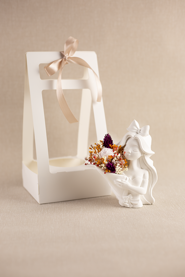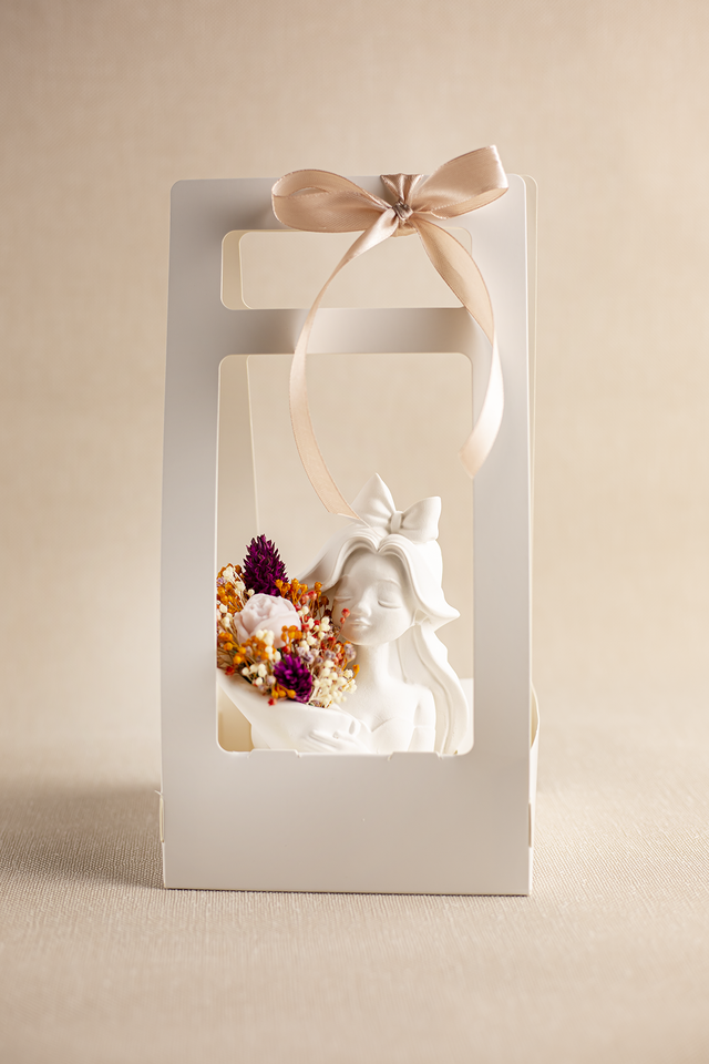 Busto de boneca em pó cerâmico, com mini arranjo floral perfumado.